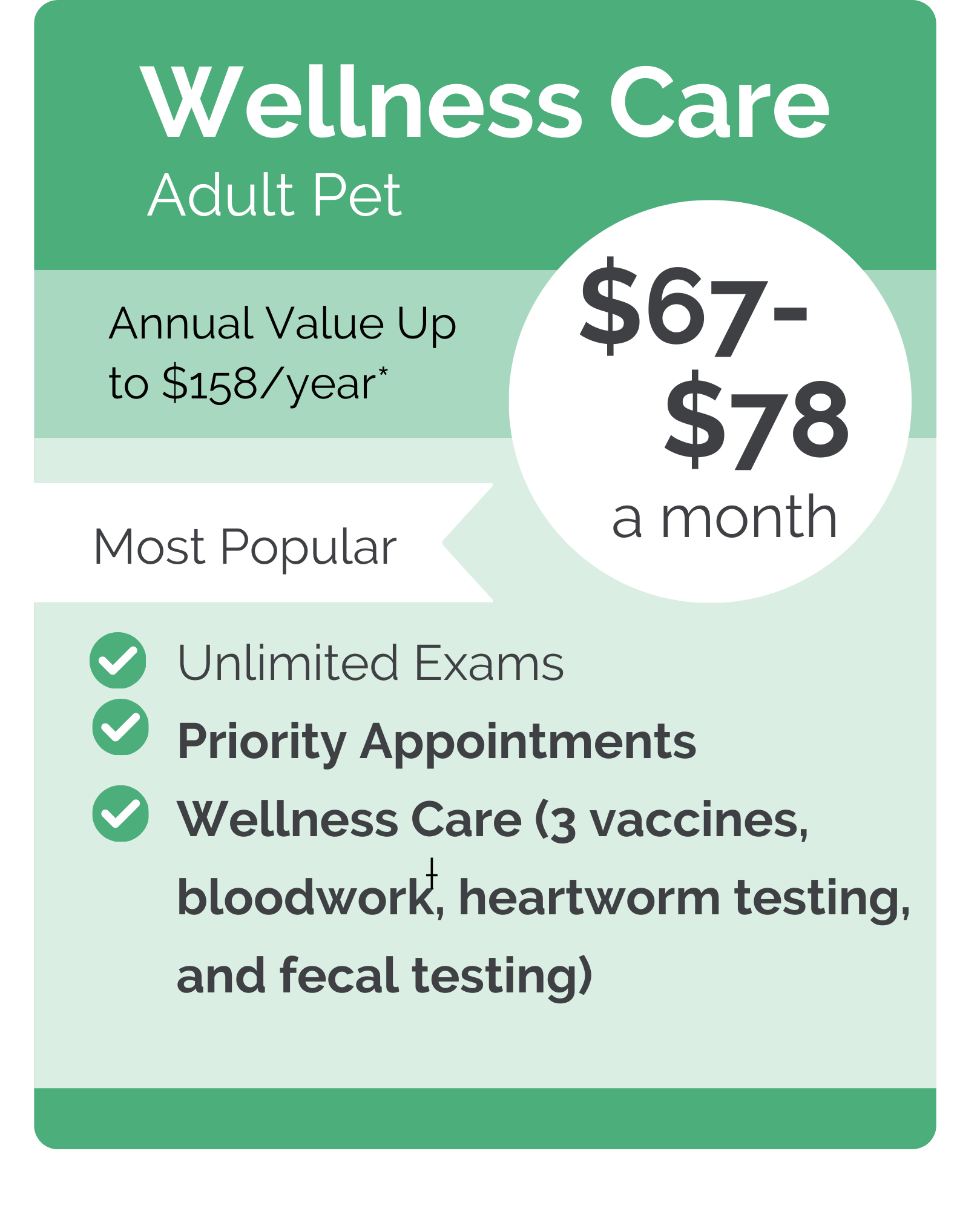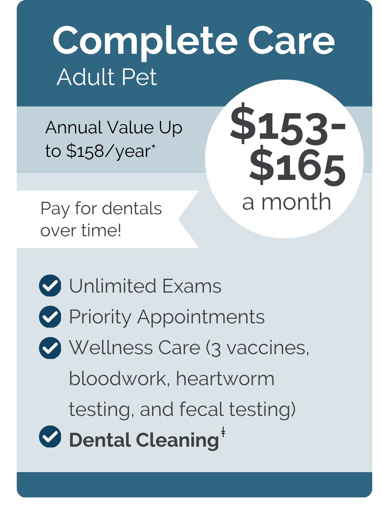 Plus, with our Wellness Care plans, you’ll enjoy priority appointments with same- or next-day scheduling whenever possible. Spread out the cost of services like dental care throughout the year, so you can give your pet the care they need without any financial stress.